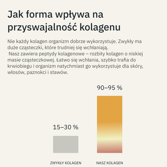 Naturalny składnik ludzkiego organizmu o wyjątkowej zdolności wiązania wody – nawet tysiąckrotność swojej masy. W formie niskocząsteczkowej jest w suplementach diety wchłaniany i rozprowadzany do tkanek, gdzie wspiera nawilżenie skóry od wewnątrz, przyczynia się do jej jędrności i gładkiego wyglądu. Pomaga wygładzać drobne linie i zmarszczki, a także wspiera stawy i tkanki łączne.